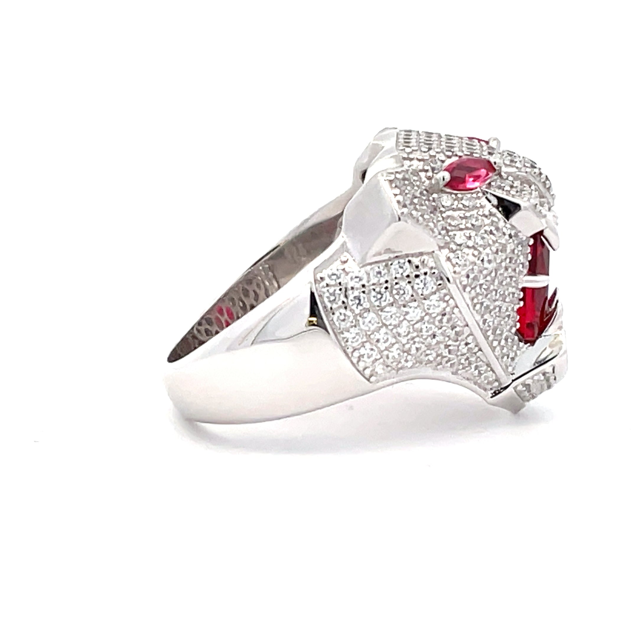 Crafted in solid Sterling Silver (925), this striking statement ring features a sculpted panther head design set with dazzling clear cubic zirconia stones. The fierce red eyes and mouth are accented with ruby-red stones, capturing the panther’s power and poise in exquisite detail.
