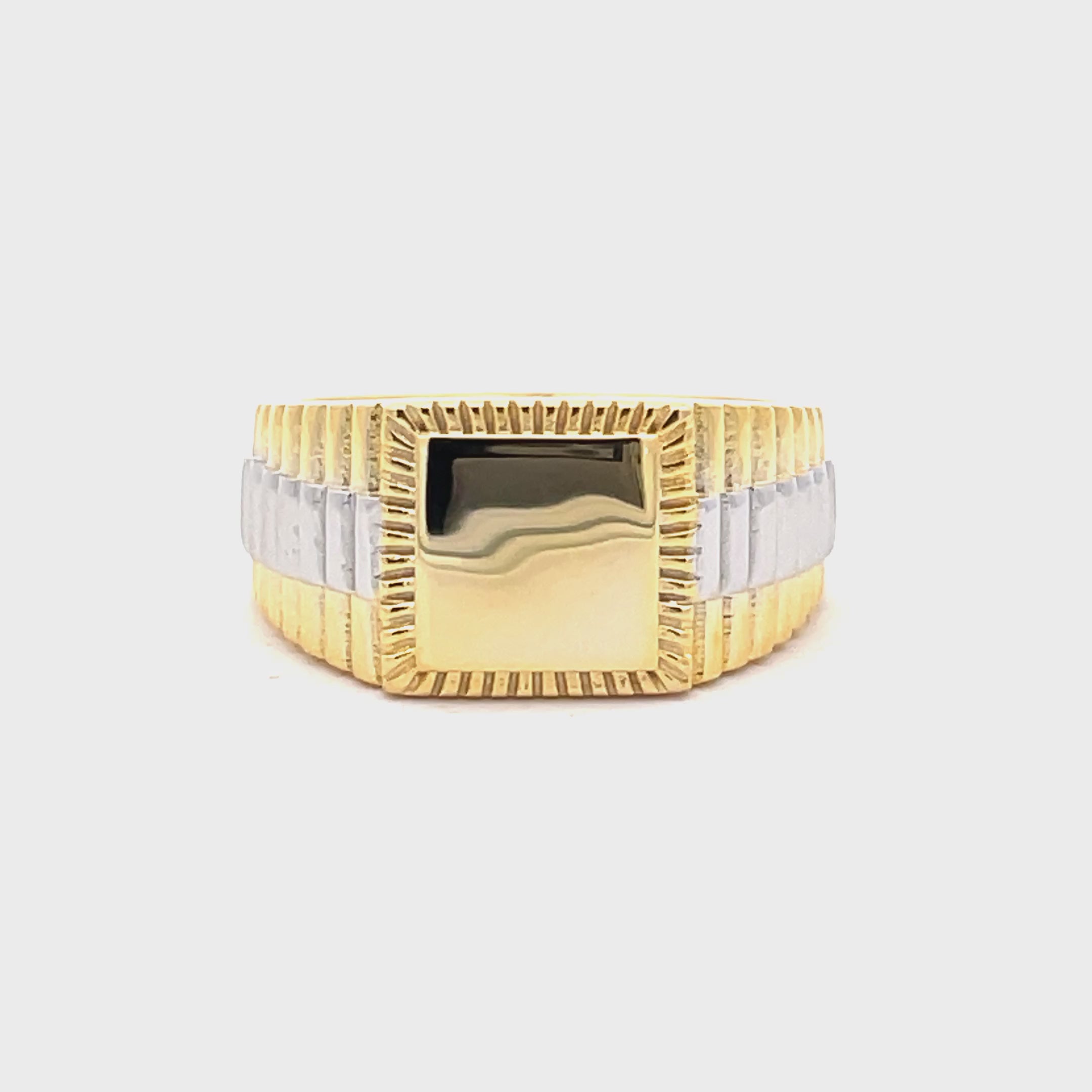 • Design: Rolex-style signet ring with rectangular face and ridged detail
