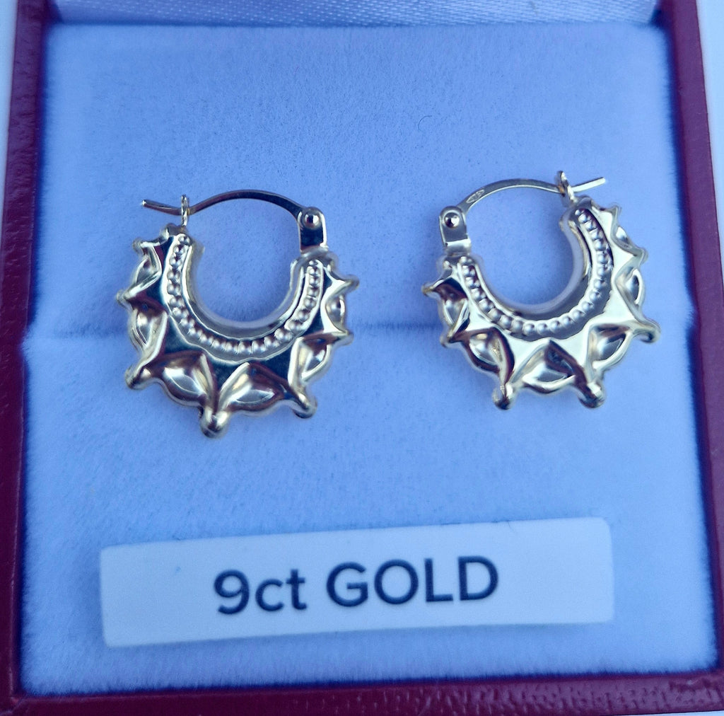 Add a bold touch of tradition with these beautifully crafted 9ct Gold Baby Creole Spike Earrings. Featuring an intricate spiked design with delicate bead detailing, these small hoop earrings are ideal for little ears or those who love minimalist statement jewellery.